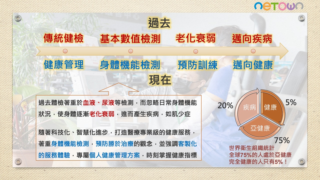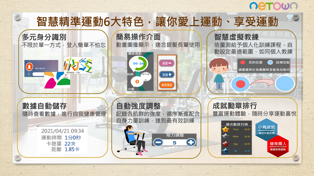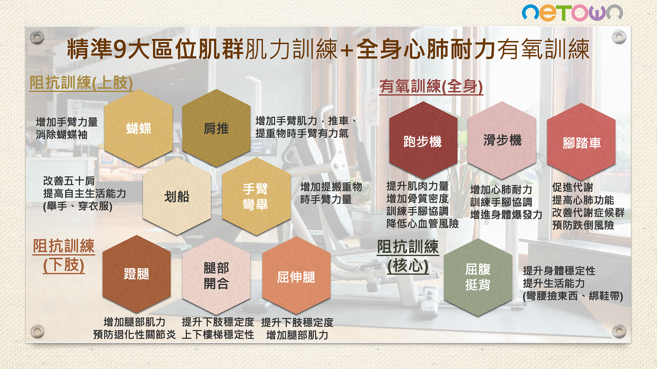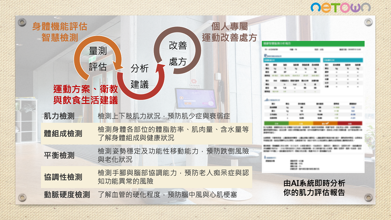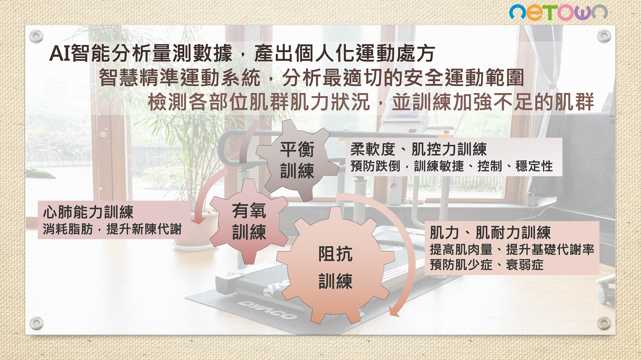 第一次來到像這樣的健康促進場域感到新奇, 不同於一般年輕人健身房高強度重量訓練, 這邊讓人感到安全安心,特別適合中年族群 ,第一次課程開始前會有完整身體狀態評估 ,評估結束馬上就給分析報告書,又有專人 解說不用怕看不懂,而且還會自動規劃適合 我的個人化運動課程,來運動二次後就覺得 體力變好了,經過三個月的課程後,