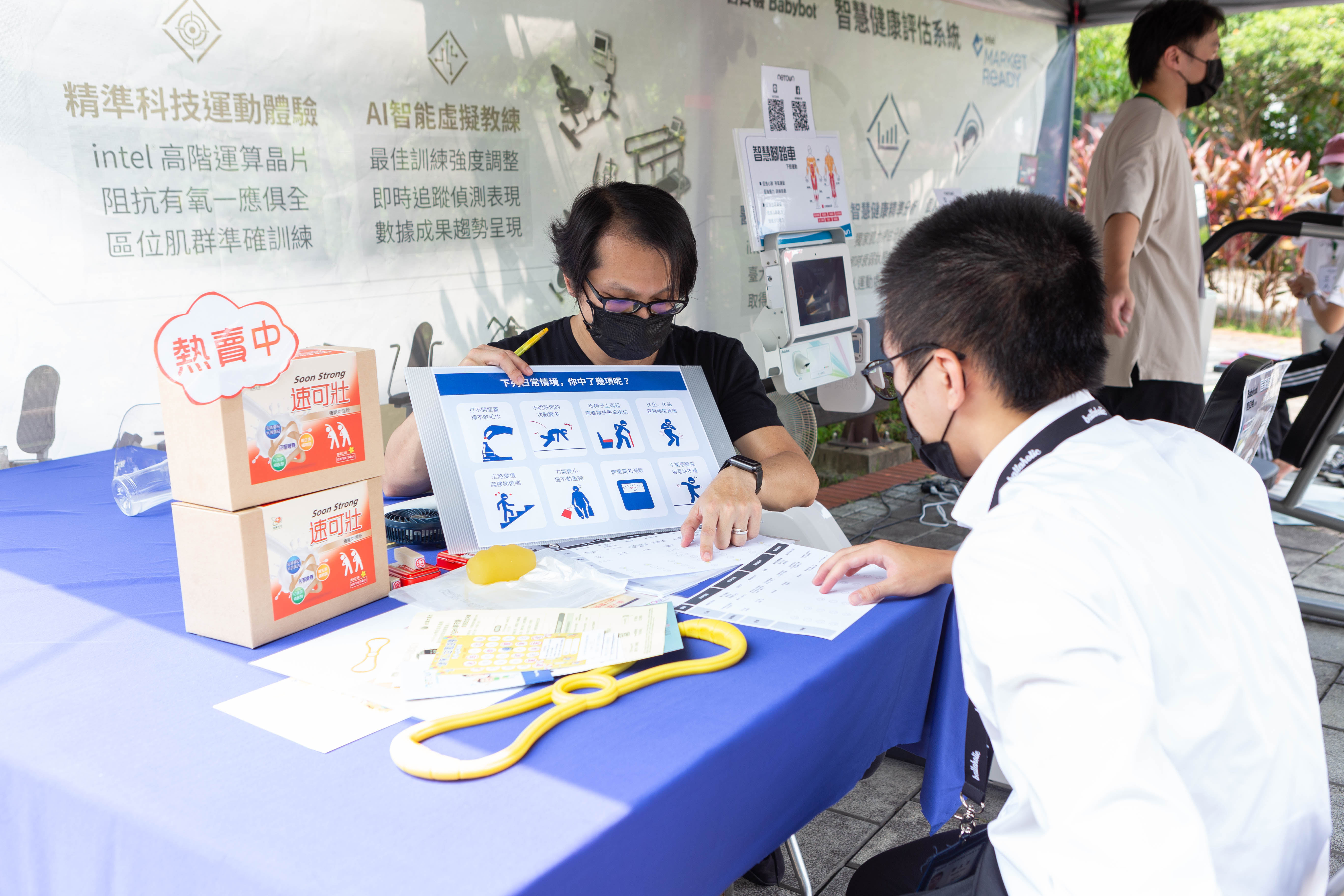 同時在園遊會以「您的健康,我們為您守護」為核心,設計趣味四關卡提升民眾健康意識,讓民眾簡單就能了解「肌肉流失」對日常生活的影響,再透過智慧寶貝機實測了解肌力狀況與體驗改善運動,並衛教日常保健之道「把健康帶回家」!